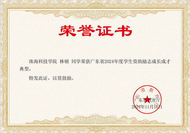 电子信息科学与技术专业林顿同学获广东省2024年度学生自主立志成才成长典型称号