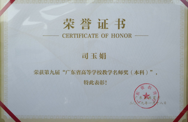 院长司玉娟教授获广东省高等学校教学名师奖
