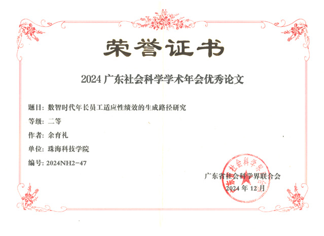 2024年,余育礼副教授撰写的学术论文《数智时代年长员工适应性绩效的生成路径研究》获评为2024年广东社会科学学术年会优秀论二等奖;同年,陈爱珍老师撰写的调研报告《珠海市产业工人队伍建设调研报告》荣获第五届珠海市哲学社会科学优秀成果奖(政府奖)二等奖。