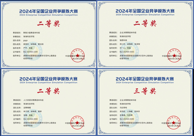 商学院学生荣获2024年全国企业经营竞争模拟大赛二等奖3项、三等奖6项
