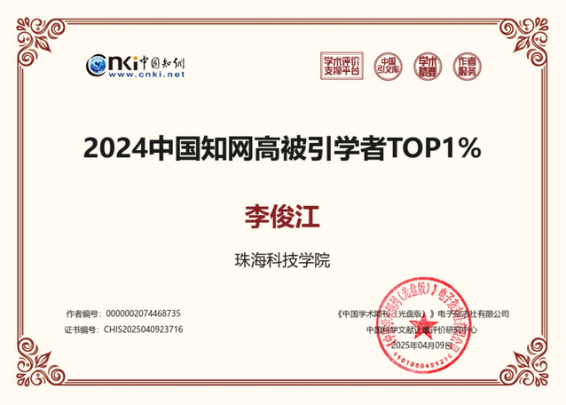 李俊江教授“2024中国知网高被引学者TOP1%”证书