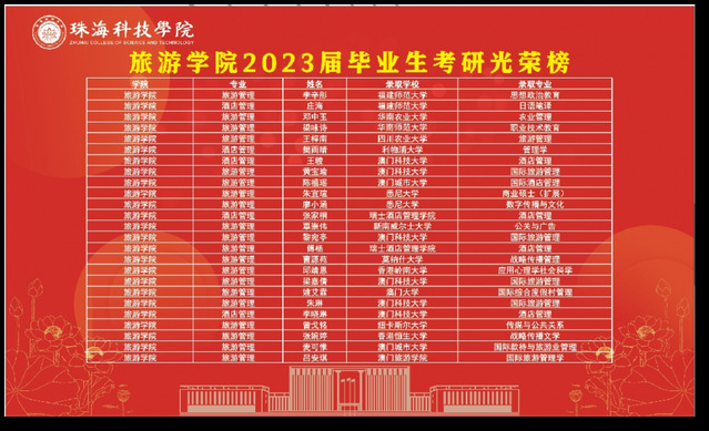 近年来,学院各专业考研升学所占比例逐渐升高,以2023届为例,毕业生被国(境)内外高校共计录取 50 人,其中境内升学18人,境外升学32人。就读的高校不乏国内知名一流大学和全球QS 排名前 50 的高校,如中国人民大学、中国社科院、中山大学、华南理工大学、吉林大学、华南师范大学、深圳大学、厦门大学、香港理工大学、澳门大学、南加州大学、哥伦比亚大学、莫纳什大学、约克大学、瑞士恺撒里兹酒店管理学院、伯明翰大学等国内外知名学府。往届毕业生中还有多名同学已经获得境内外高校博士学位或正在攻读博士学位,如行政管理专业毕业生、中国人民大学博士、国家发展改革委国家信息中心应用经济学博士后、广东财经大学教师黄文浩,2011届毕业生、获澳门城市大学旅游管理专业博士学位的杜昀倩等。