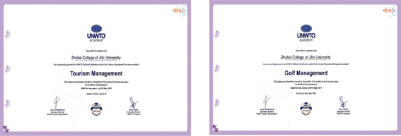 2019年旅游管理、高尔夫管理两个项目通过了联合国世界旅游组织(UNWTO)旅游教育质量国际认证(TedQual)