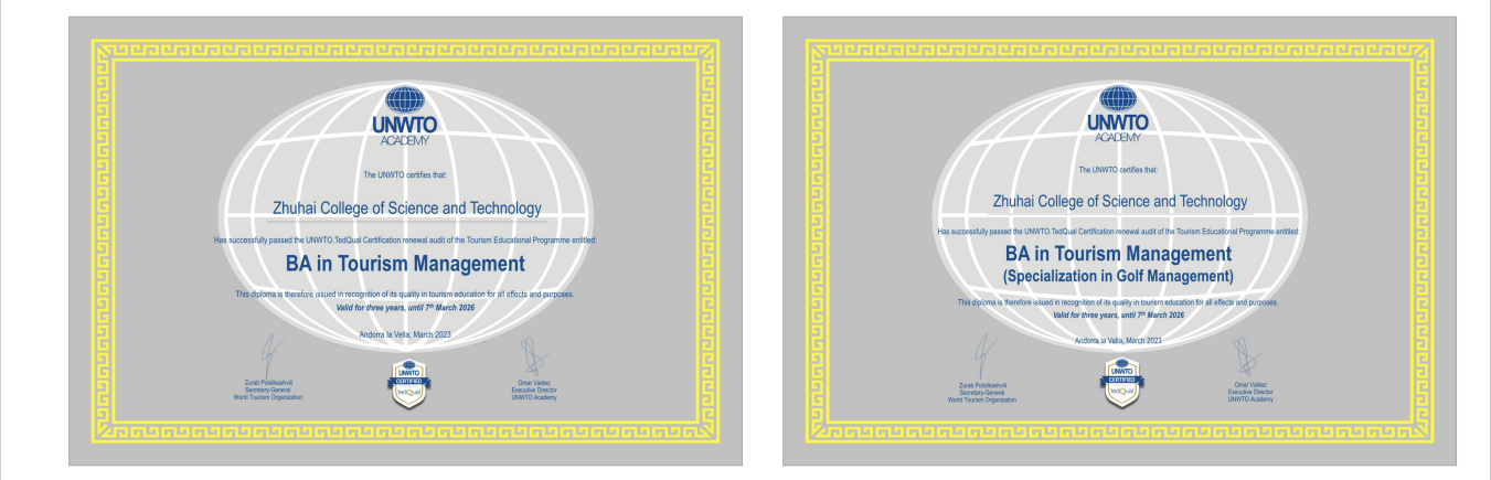 2023年旅游管理、高尔夫管理两个项目通过联合国世界旅游组织(UNWTO)旅游教育质量国际认证(TedQual)