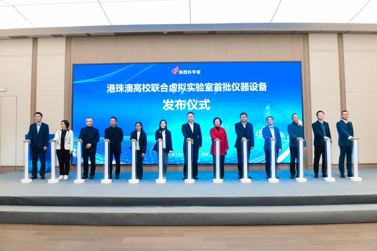 在港珠澳高校联合虚拟实验室首批仪器设备发布环节,方壮坚副校长与珠海高新区党工委委员、区管委会副主任田力及港澳和内地高校院所代表共同按下启动光柱,标志着这一打破空间屏障的“云端创新共同体”正式上线。