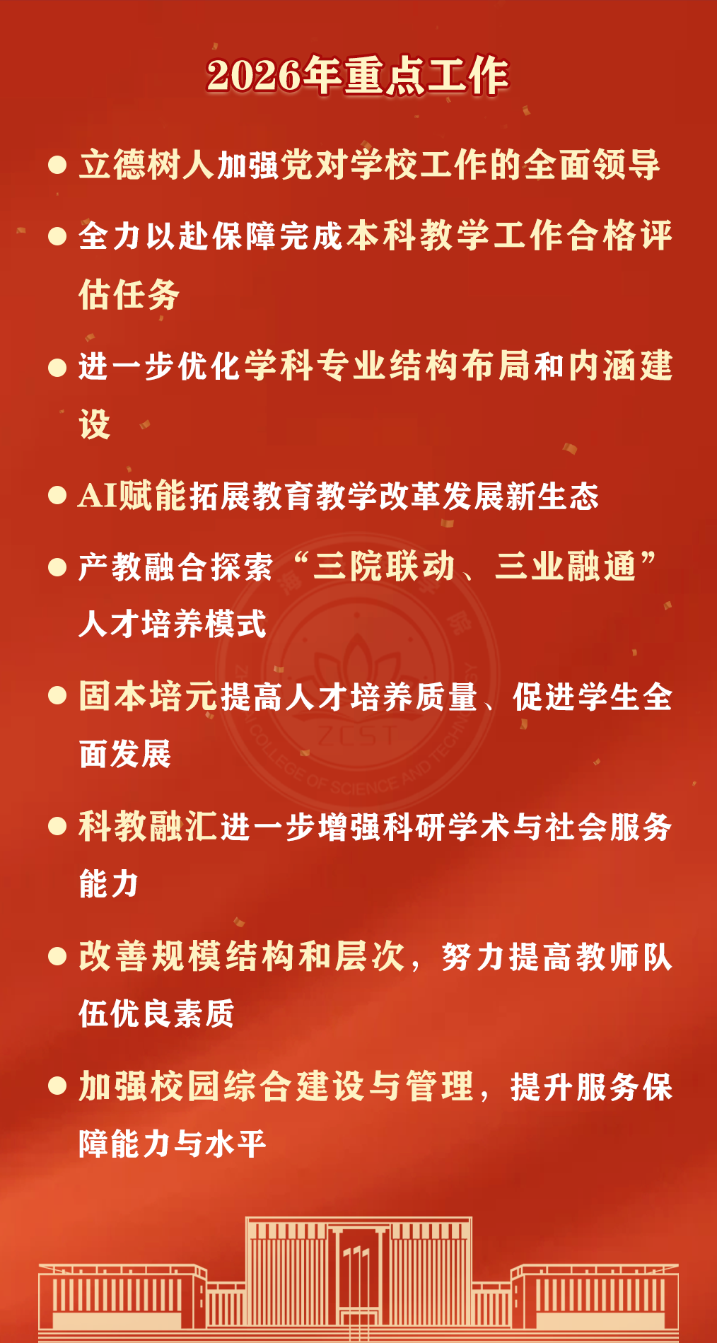一是扎实开展树立和践行正确政绩观学习教育,以科学理念引领学校事业高质量发展。树立和践行正确政绩观,是推动学校事业长远发展的思想根基。要始终牢记为党育人、为国育才的初心使命,把立德树人成效作为检验一切工作的根本标准,把学生成长成才作为办学的重要落脚点,做打基础、利长远、惠学生的实事。学科专业是学校发展的核心竞争力,也是践行正确政绩观的重要载体,要以战略性思维谋划学科专业布局,以务实举措服务新质生产力发展,全力推动AI与教育教学各环节深度融合,同时持续加强教师人工智能素养系统培训,推动教育理念更新和教学模式创新。就业是最大的民生,各单位要把实习就业工作摆在重要位置,做到全年抓、全员抓、全过程抓,对照教育部、省教育厅相关文件要求,进一步健全实习就业工作责任体系,及时排查实习风险隐患,分层分类开展就业指导,引导学生树立正确的择业观,并精准对接企业用人需求,全力促进毕业生更高质量、更充分就业。