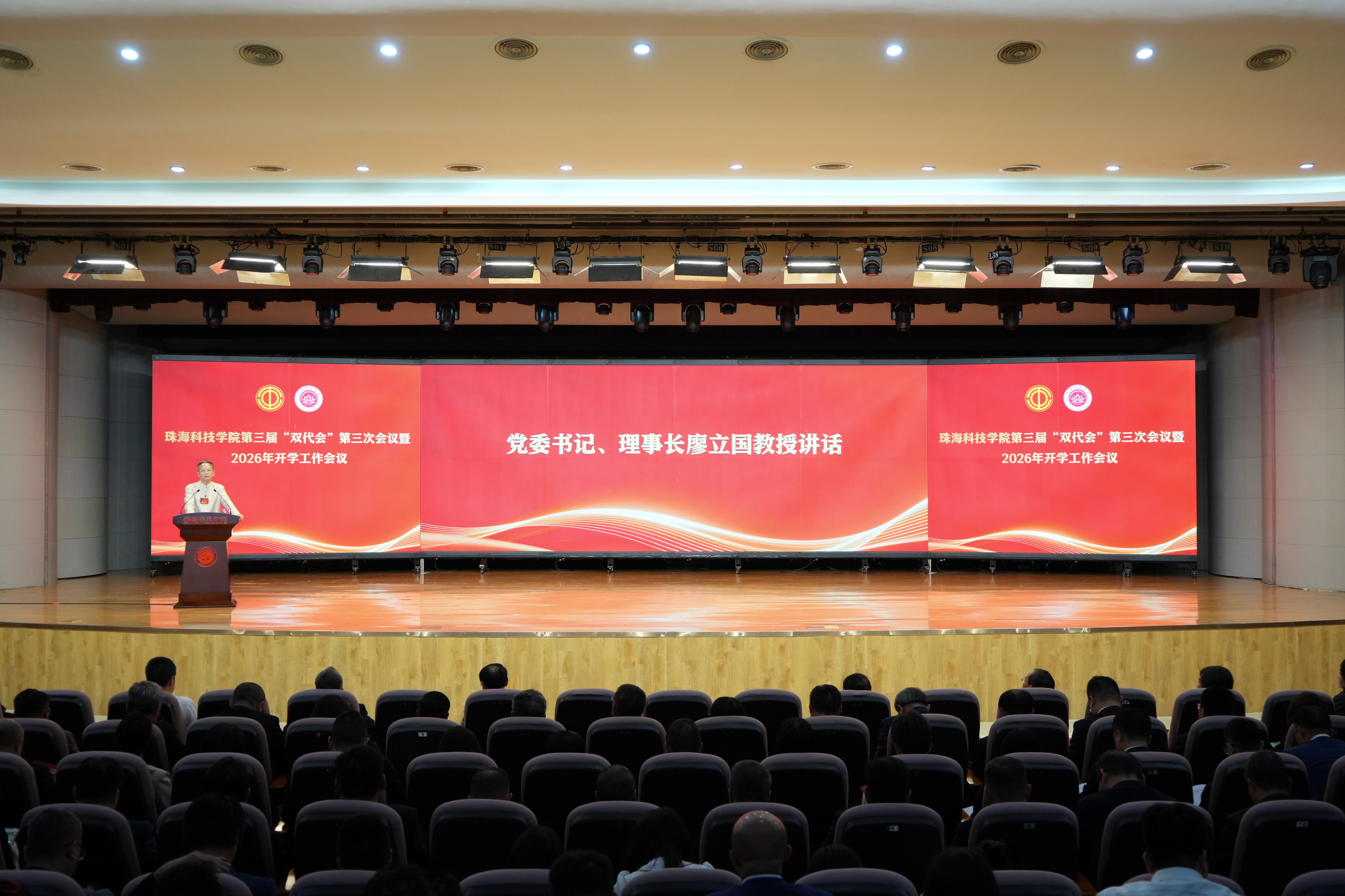 “刘鸣校长所作的学校工作报告切合学校实际,顺应未来产业发展脉络,高瞻远瞩,指导性强,各单位要认真学习领会,将其作为新一年教育教学的指引。张殿波校长所做的工会工作报告饱含温情,既有生活关怀,又有工作态度,工会真正做到了让大家拥有温馨的家、健康的身体。”廖立国代表学校理事会、党政领导班子向大会的胜利召开表示祝贺,对新学期开学工作给予高度评价,向全体代表、工作人员及寒假期间坚守在评估评建、后勤、基建、宣传、安全保障等各条战线的教职员工表示感谢。“过去,大家都在各自岗位上都付出了巨大努力,更是在立德树人的实践中,生动诠释了教育工作者的情怀与大爱,用行动点亮学生的成长之路。”