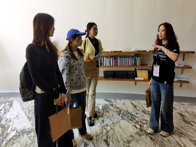 值得一提的是,我校2024届文学院汉语言文学专业毕业生、现就读于圣若瑟大学工商管理硕士课程的周杨娜同学作为校方特别安排的学生代表,热情接待了来访师生。她带领大家参观校园,并结合自身经历,分享了在圣大的学习与生活体验。她表示,圣大的全英文教学模式和多元文化氛围让她受益匪浅,不仅提升了语言能力,也拓宽了国际视野,尤其是小班制教学带来了更深入的学术互动和个性化指导。她还耐心解答了同学们关于赴澳读研的各类问题,为有意深造的学弟学妹提供了宝贵参考。
