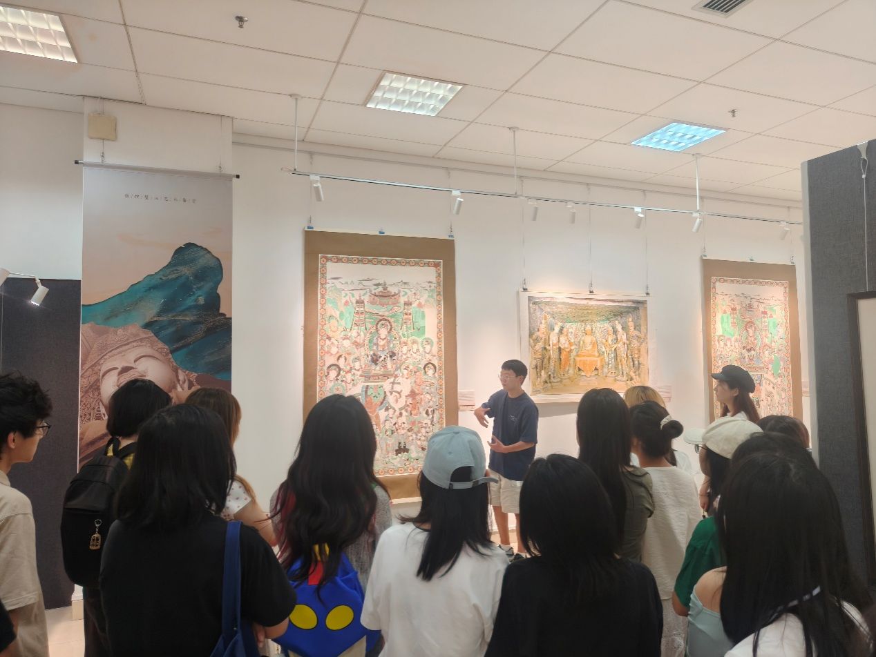 移步敦煌壁画艺术鉴赏展,70余幅从北魏绵延至西夏的精摹壁画,铺展开一部流动的文明史诗。该校历史系硕士生以专业生动的讲解,引领师生穿越时光长廊:莫高窟257窟《鹿王本生》的佛本生叙事、220窟初唐供养菩萨的飘逸神韵、217窟盛唐观音的慈悲法相,无不在色彩与线条中彰显着信仰与艺术的交融。同学们凝神静观,惊叹连连体会在佛教艺术中生动呈现出的佛教思想。