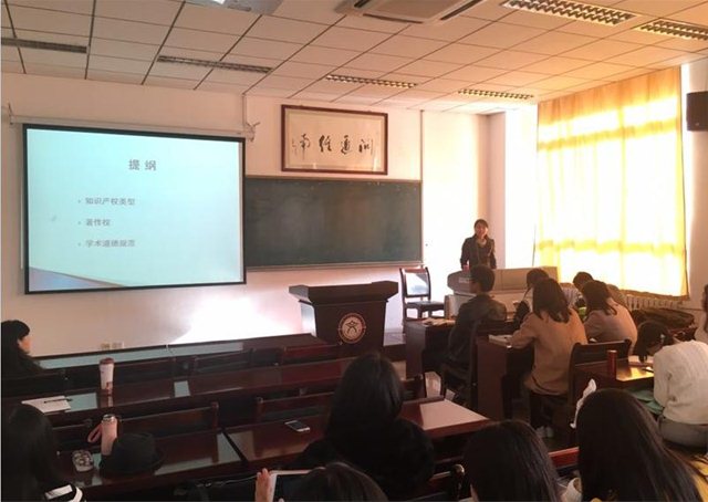 杨老师从知识产权类型、著作权和学术道德等相关方面进行了讲解,并详细介绍了知识产权中的专利权、商标权、著作权等,著作权法中的文字作品、口送作品、美术、建筑作品、摄影作品等,以及著作权人的权利中的发表权署名权等,给学生们进行了相关知识普及并配以具体的案例。之后,杨老师在讲座中还叙述了作品取得著作权的条件和关于抄袭的认定以及学位作假行为的处理办法,让我们受益匪浅。