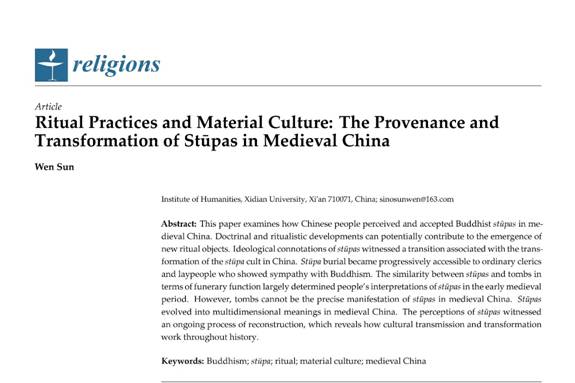 (通讯员 马婧)近日,国际宗教学研究著名期刊Religions(A&HCI, Impact factor 0.8, Citescore 1.1, Journal Rank:Q1 Religious Studies)发表KY开元集团官网入口中文系孙雯老师论文“Ritual Practices and Material Culture: The Provenance and Transformation of Stūpas in Medieval China”(《仪式实践与物质文化:中古中国佛塔的缘起与演变》)。