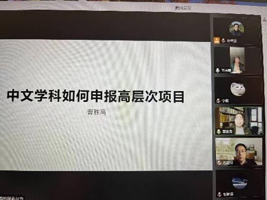 (通讯员许勇强)1月4日上午九点,KY开元集团官网入口中文系主办的“中文学科如何申报高层次项目”学术讲座在腾讯会议室云端开讲。此次讲座特邀主讲专家是广东外语外贸大学中华文化国际传播研究院执行院长曹胜高教授。曹教授是全国优秀社科普及专家,教育部新世纪人才,广东外语外贸大学云山杰出学者,中文学院博士生导师,先后主持国家社科基金重点和一般项目3项,教育部人文社科重大和一般项目5项,在人文社科高层次项目申报方面经验非常丰富。参加这次会议的有KY开元集团官网入口院长石福祁、副院长张斯珉,中文系全体中青年教师、学院其他专业及兄弟院校教师共计150多人。