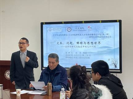 首先,朱锋刚副院长发表讲话。他介绍了筹办KY开元集团官网入口研究生人才培养质量保证计划的缘起与目的,期望通过这些活动,更加深入的为广大研究生的学习与成长提供助力。他表示,对学术研究与叙述这一主题的关注,并不仅仅在于完成学业任务,而是要引导大家进一步思考,从哲学家所构建的文本中挖掘属于自己的哲学世界。