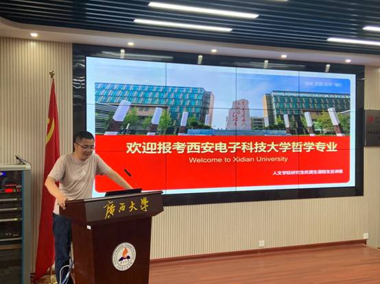 6月23日,王雨程、张万强两位老师在广西大学马克思主义学院101教室,面向广西大学哲学系18级在校同学进行了研究生招生宣讲。本次宣讲由广西大学哲学系主任黄小洲教授主持,由张万强老师进行具体介绍。张老师围绕近些年来研究生招生考试的考情,西安的历史文化与区位发展优势,学校与学院的基本情况,哲学研究生招生的方向与侧重点,以及选择西电哲学专业就读深造所具有的比较优势等内容,谈了自己的认识与体会,并邀请大家“常来长安,常来西电,常来常往”。最后,二位老师还就在场同学提出的选择西电哲学就读的报考与招录比、中国哲学与佛教研究以及如何备考西电哲学等问题进行了回应。