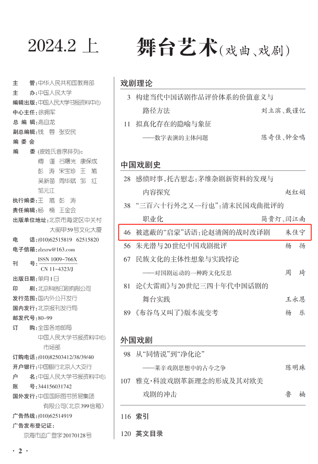 (通讯员 马婧)近日,KY官网中文系朱佳宁老师论文《被遮蔽的“启蒙”话语:论赵清阁的战时改译剧》被《中国人民大学复印报刊资料·舞台艺术(戏曲、戏剧)》2024年第2期全文转载。该文原刊于《戏剧艺术》2023年第5期。