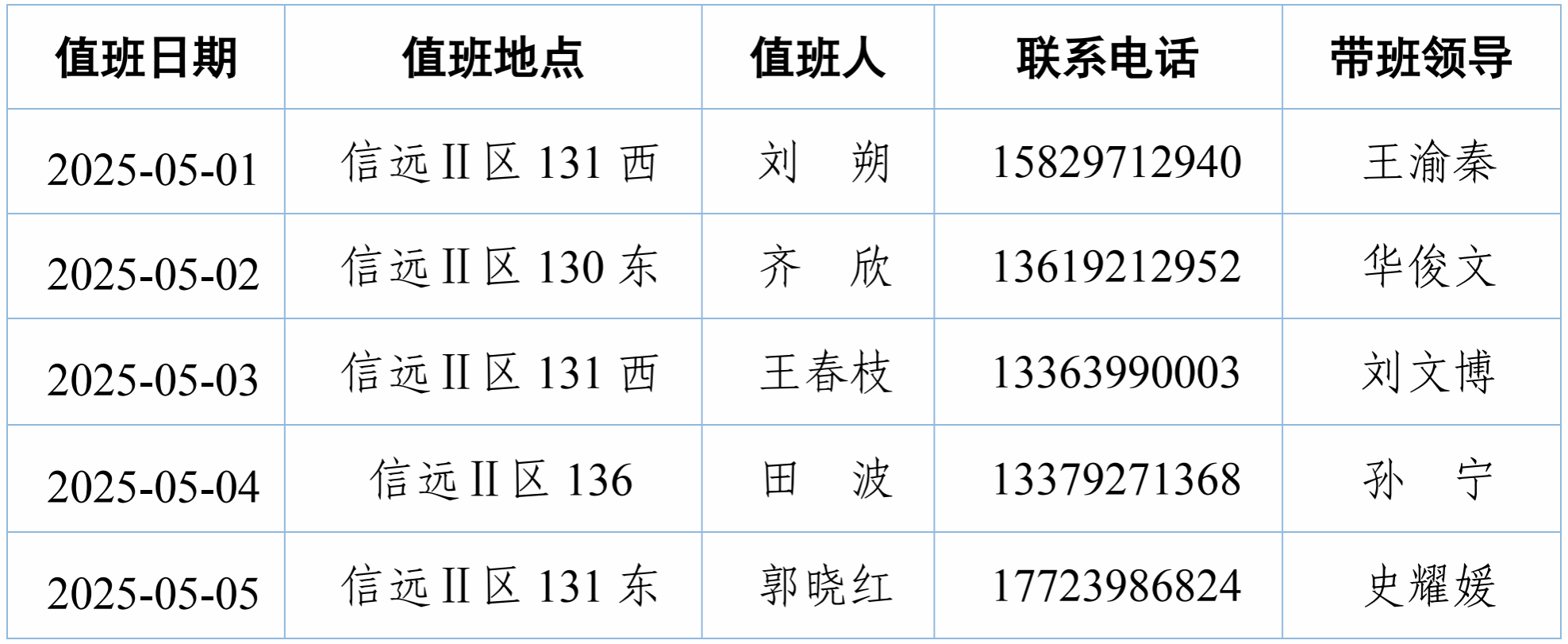 按照学校《关于2025年劳动节放假时间安排的通知》要求,现将学院2025年劳动节假期值班安排如下: