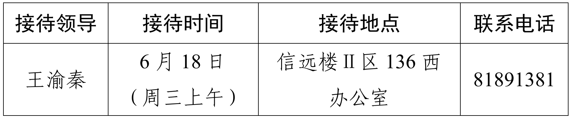 注:学院领导班子接待日主要受理的事项:1.学院人才培养、教学科研、学科建设、教师发展、对外交流、学生管理和服务保障等方面存在的问题与建议;2.反映有关学院重要决策和重要工作事宜的问题;3.涉及师生员工利益的申诉和诉求;4.亟须学院处理的难点问题;5.其他方面的建议和意见。