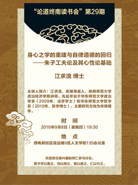 主讲人:江求流博士 主讲人简介:江求流,安徽寿县人,陕西师范大学政治经济学院讲师。先后毕业于华东师范大学政治学系(2009年,法学学士)和华东师范大学哲学系(2015年,哲学博士)。主要研究方向为宋明理学。