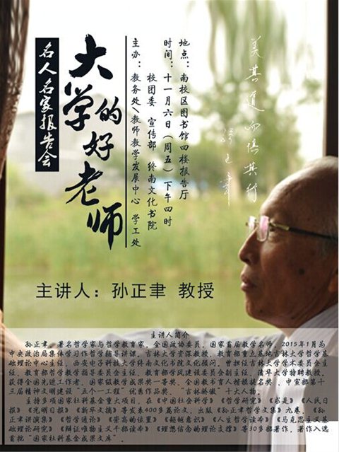 吉林大学哲学社会科学资深教授孙正聿委员的哲学课,被学生们称为吉林大学的一道靓丽景观:艰深的哲学,在他的讲授下,不仅成为通俗易懂的道理,而且成为亲切的思想交流。因此他讲课时总是座无虚席,甚至过道里也挤满学生。听完课的人总是发出这样的感叹——“听孙老师的课是令人难忘的享受!”(光明日报)