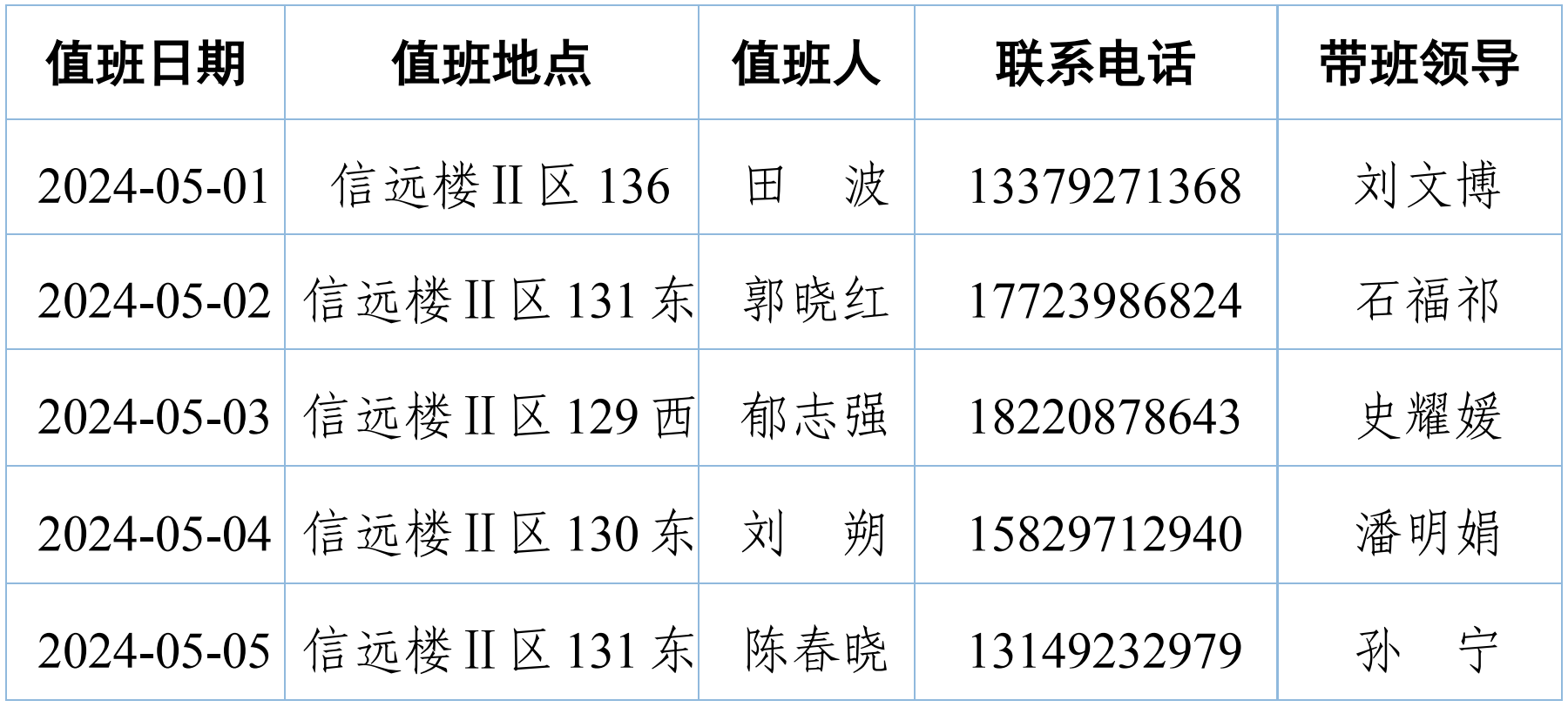 按照学校《关于2024年劳动节放假时间安排的通知》要求,现将学院2024年劳动节假期值班安排如下: