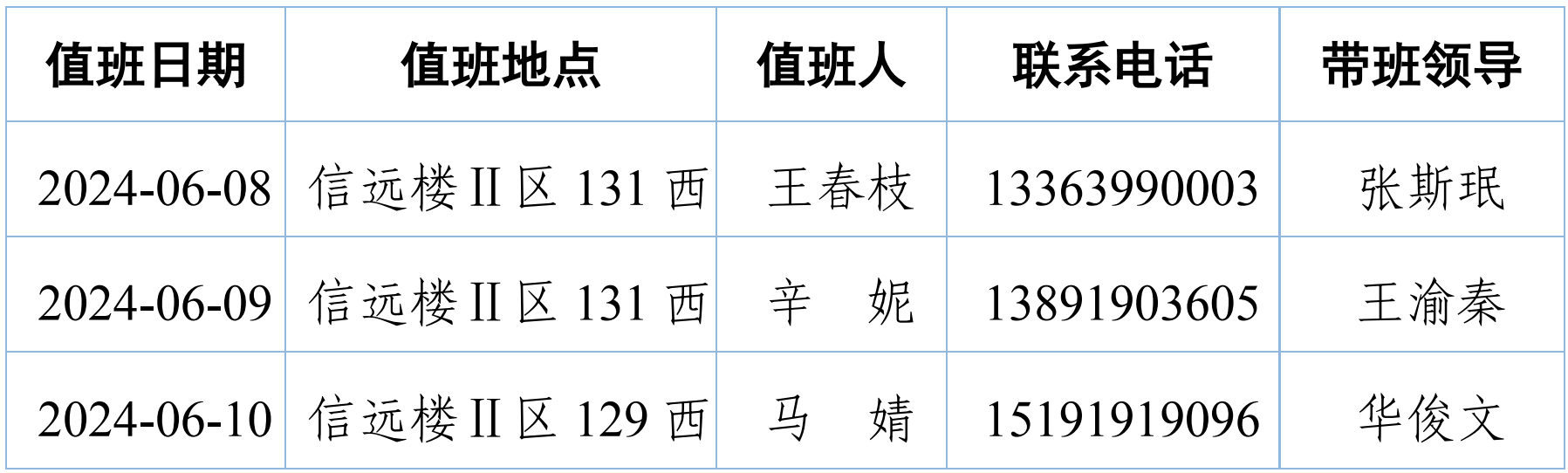 按照学校《关于2024年端午节放假时间安排的通知》要求,现将学院2024年端午节假期值班安排如下: