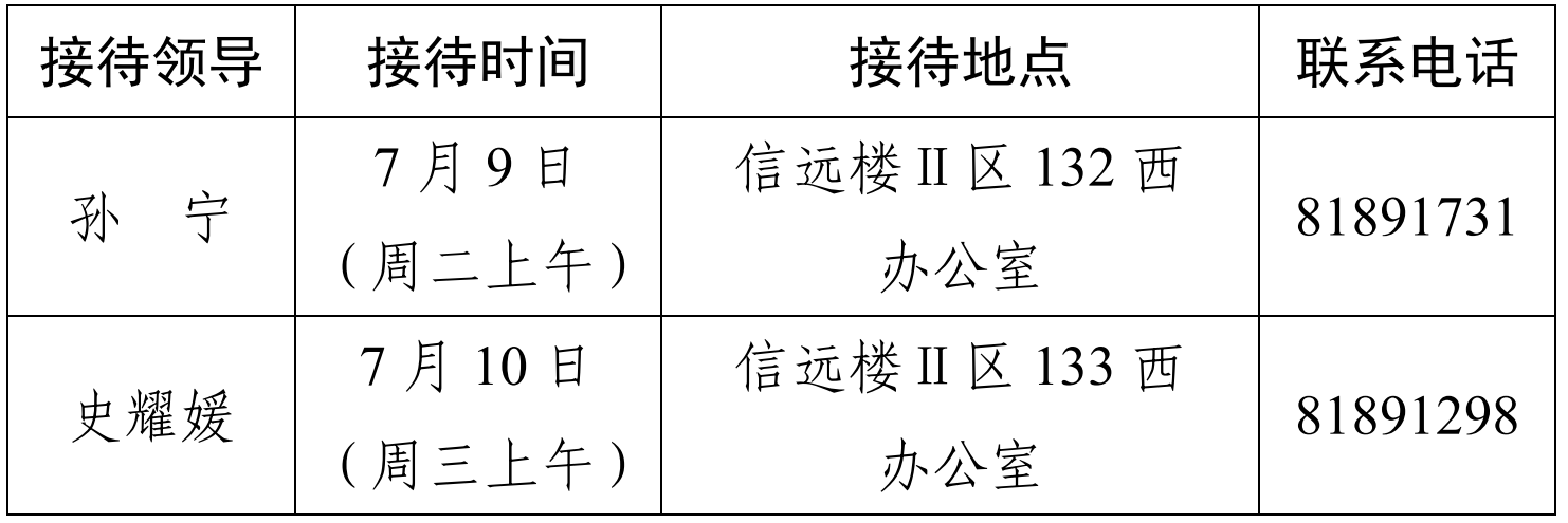 注:学院领导班子接待日主要受理的事项:1.学院人才培养、教学科研、学科建设、教师发展、对外交流、学生管理和服务保障等方面存在的问题与建议;2.反映有关学院重要决策和重要工作事宜的问题;3.涉及师生员工利益的申诉和诉求;4.亟须学院处理的难点问题;5.其他方面的建议和意见。