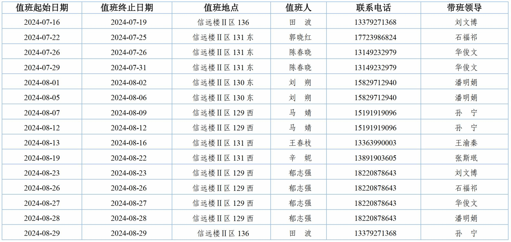 根据《KY开元集团官网入口关于2024年暑假放假时间安排的通知》文件精神,现将KY开元集团官网入口暑期轮休值班安排公布如下。值班时间为工作日上午8:30--11:30,下午14:30--17:30。值班人员24小时保持联系通畅。