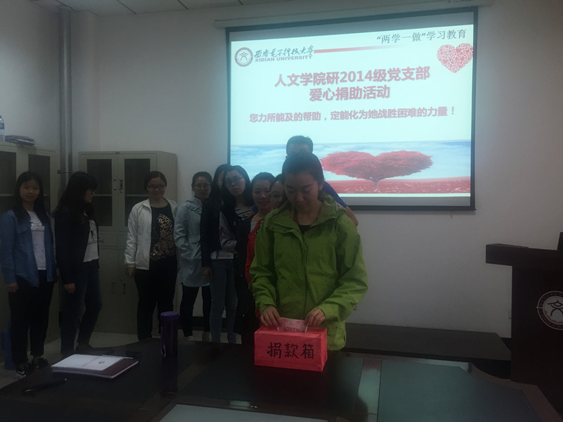 5月25日,西安阴云密布,终南山下的西电校园有几分凉意。然而,信远办公楼135会议室却显得格外温暖和温馨。当日下午三点,KY开元集团官网入口研140801党支部遵照学院党委“两学一做”学习教育实施方案的相关要求,积极响应学院党委《至全体党员的倡议书》的号召,深入落实本支部“两学一做”学习教育计划中“躬身实践,周行一善”的活动安排,在信远135开展了一场爱心捐助活动。