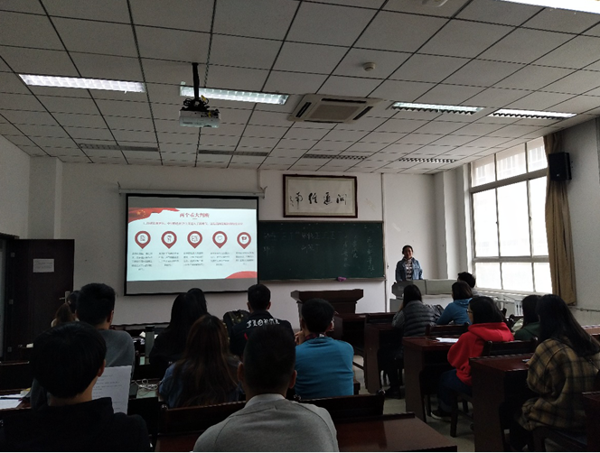 “学习十九大精神”主题团日活动由团支书郑月主持。郑月首先以ppt展示的形式为同学们搜集梳理了十九大报告的核心内容,重点围绕“新时代、新思想、新目标、新征程”等关键词与同学们进行了互动讨论。同学们纷纷表示国家在日益富强起来,作为新时代青年要努力学习、提升本领,为祖国富强发展储备知识能量。