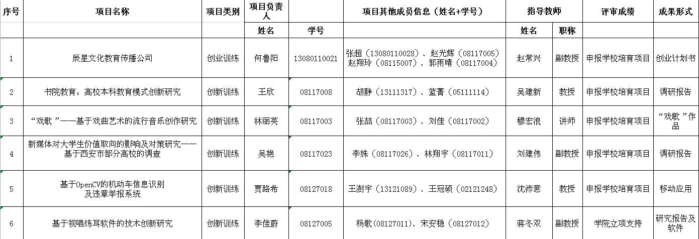 经过评审答辩和讨论,评审组选出了《“戏歌”——基于戏曲艺术的流行音乐创作研究》、《书院教育:高校本科教育模式创新研究》、《新媒体对大学生价值取向的影响及对策研究——基于西安市部分高校的调查》、《基于OpenCV的机动车信息识别及违章举报系统》、辰星文化教育传播公司等5个具有创新性、可行性的项目向学校申报2014年国家大学生创新创业计划培育项目,同时学院也对于较为优秀的项目《基于视唱练耳软件的技术创新研究》立项支持,开展进一步培育。