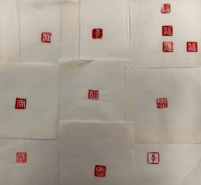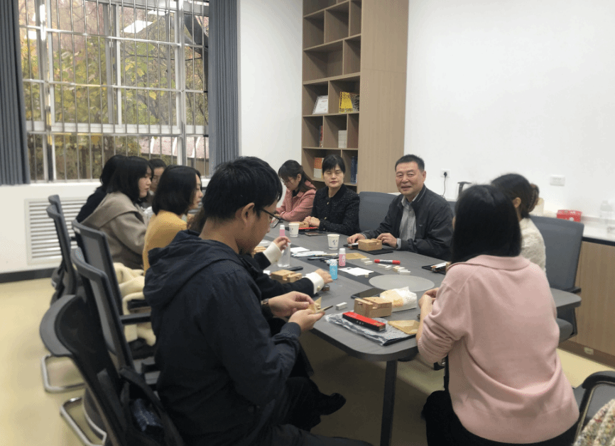 活动伊始,中文系王跃老师向大家简要介绍了篆刻艺术的历史沿袭、石材选择、字体演变、执刀手法、雕刻技巧等;随后,老师们按照讲解内容进行体验练习,大家利用橡皮章刻制“博学”“审问”“慎思”“明辨”“笃行”“和”“福”等内容,以表达严谨务实的学术态度和对美好生活的祈愿。从打磨印石、印稿上石,到认真书写、精心篆刻,一方方质朴的篆章在老师们手中诞生。篆刻环节结束后,大家纷纷在空白纸上试盖亲手篆刻的印章,本次活动圆满收官