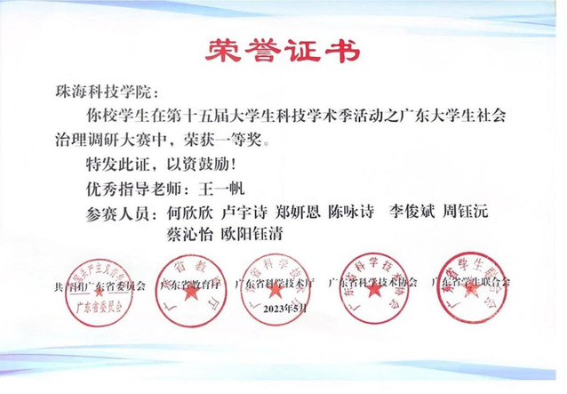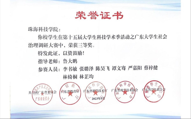 图8:获得第十五届大学生科技学术季活动之广东大学生社会治理调研大赛一等奖和三等奖