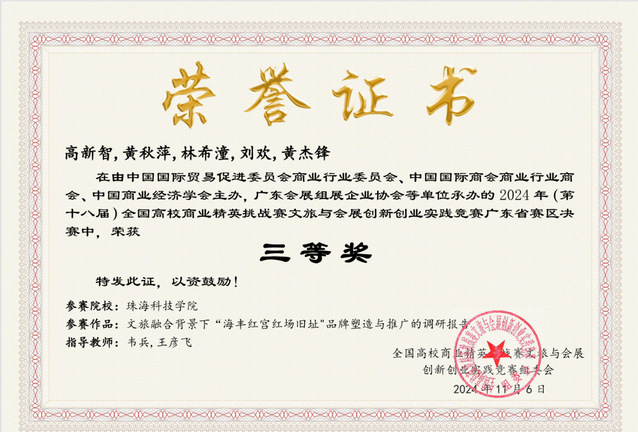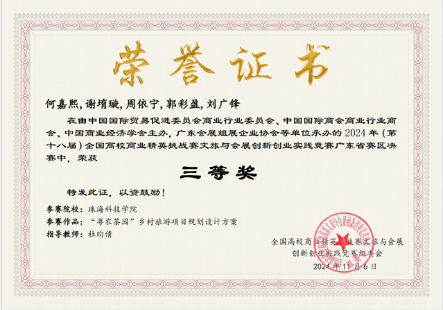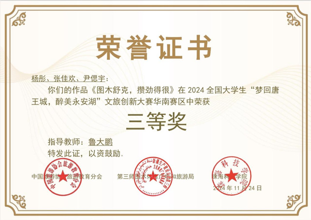 图15:获得2024全国大学生“梦回唐王城,醉美永安湖”文旅创新大赛华南赛区三等奖