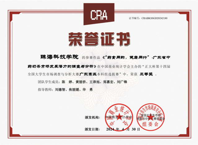 图12:获得第十四届“正大杯”全国大学生市场调查与分析大赛广东赛区本科组三等奖