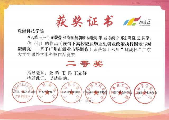 经过系统培养,专业学生具备较深厚的人文科学素养、科学精神以及创新创业能力,多名同学在参加“互联网+”大学生创新创业大赛、“挑战杯”大学生课外学术科技作品竞赛、“创青春”中国青年创新创业大赛等学科类比赛以及其他各类课外竞赛中屡获佳绩。此外,专业教师教学与科研并重,所承担的各类科研项目、学术论文及专著、社会服务等方面也获得较好的社会评价和多个奖项。