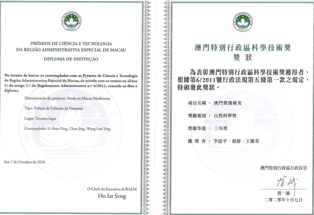 本专业王兰英老师获得2020年度澳门特别行政区科学技术奖三等奖