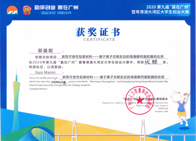 本专业学生在2020年第九届粤港澳大湾区大学生创业大赛中荣获优胜奖