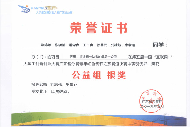 图8:2019年获第五届中国“互联网+”大学生创新创业大赛广东省分赛银奖