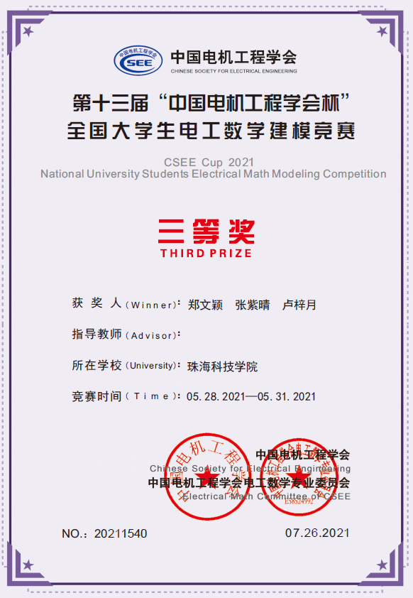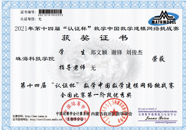 郑文颖等获认证杯数学网络挑战赛优秀奖