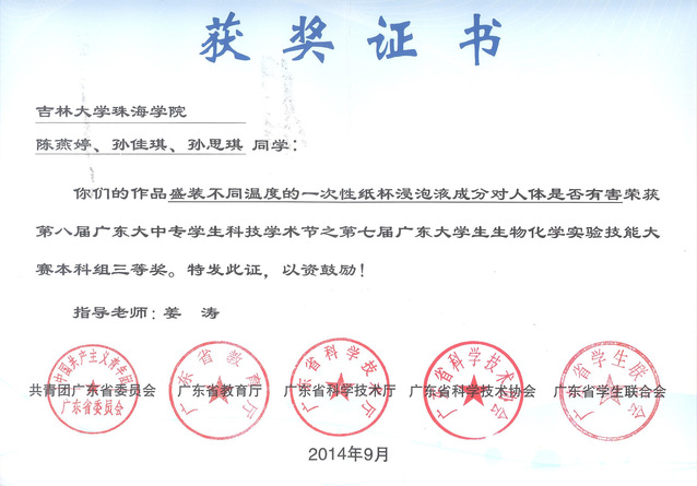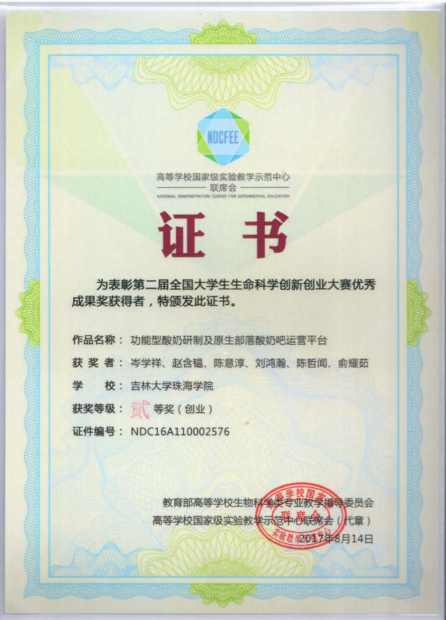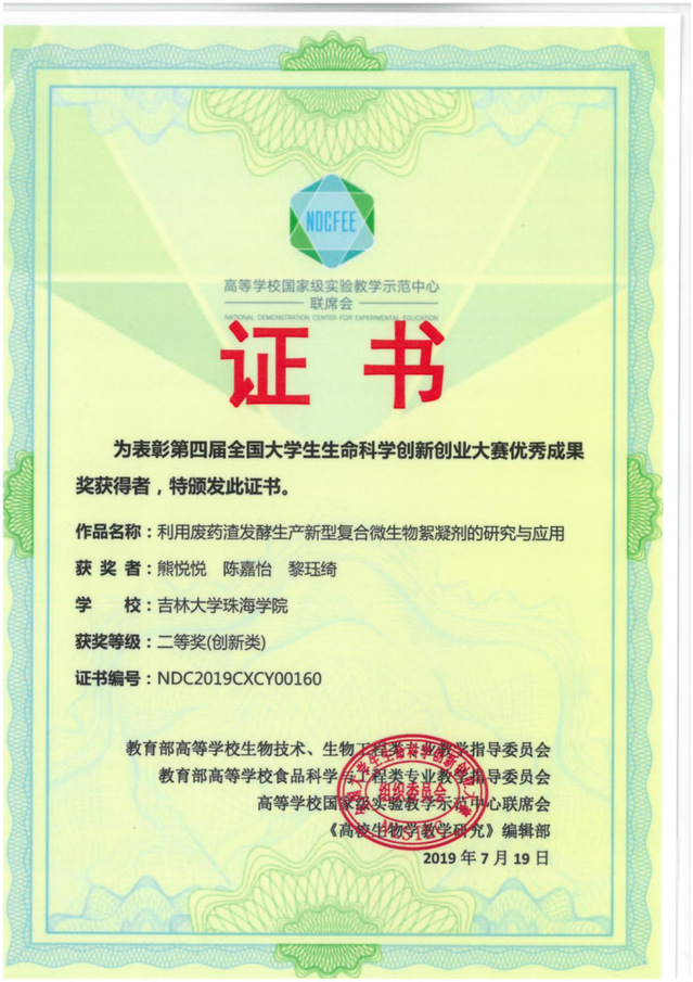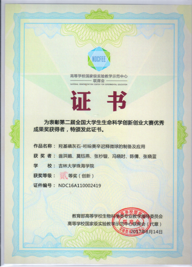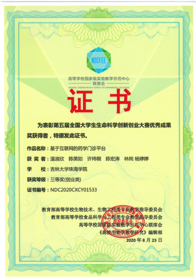 图6. 第二届全国大学生生命科学创新创业大赛获奖证书