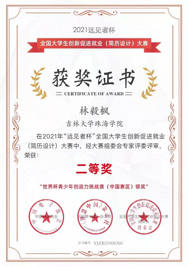 全国大学生创新促进就业(简历设计)大赛暨世界杯青少年创造力挑战赛中国赛区 银奖